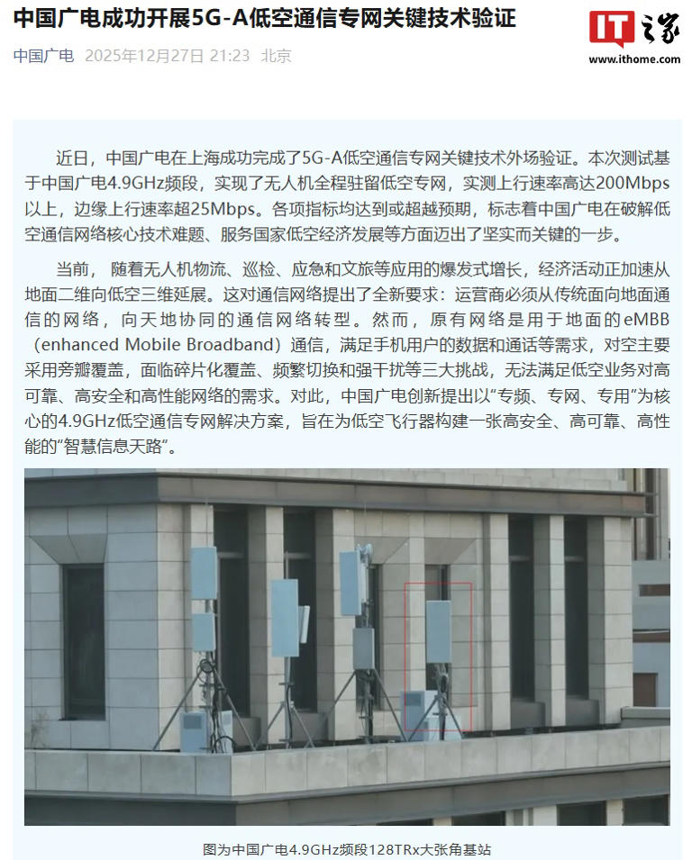 随着低空经济被确立为国家战略性新兴产业,其规模化发展对安全、可靠、高效的通信网络提出了前所未有的迫切需求。在这一背景下,作为我国第四大基础电信运营商的中国广播电视网络集团有限公司(简称“中国广电”)近期取得了一项关键性技术突破。该公司成功完成了面向低空经济的5G-A(5G-Advanced)通信专网关键技术验证,标志着我国在构建满足低空飞行器高动态、广覆盖、高可靠通信需求的专用网络能力上迈出了坚实一步。