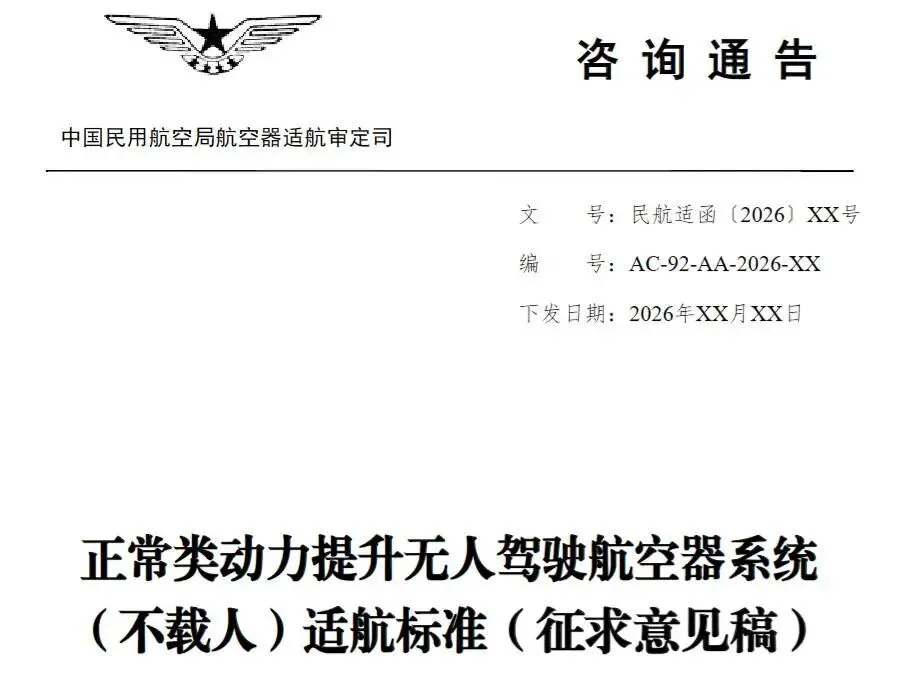 2026 年 2 月 26 日中国民航局适航审定司发布的《正常类动力提升无人驾驶航空器系统不载人适航标准征求意见稿》,为 150 公斤以上的中大型无人机划定了清晰的安全运营边界,这份长达百页的专业文件看似晦涩,实则为万亿级低空经济的发展筑牢了法规基石,让城市空中交通、大型无人机商用等曾经的概念化场景,拥有了从试验场走向商业化的明确准则,也标志着我国低空经济产业正式告别野蛮生长,迈入标准化、规范化的全新发展阶段。